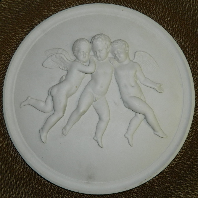 Tre svævende engle (Tro, Håb og Kærlighed) af Bertel Thorvaldsen, der modellerede denne i Rom i 1805. Kopi i bisquit for Bing & Grøndahl i katalog 1866. Platten her er således produceret mellem 1866-1900. Fremstår i perfekt stand. 32½ cm i diameter. Er også lavet i en midre udgave for Royal Copenhagen.