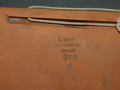 Platte i teracotta fra Peter Ipsen, Kjøbenhavn. Motiv med babyer der plukker og spiser druer. Lille skår på plattens nederste venstre hjørne. Fremstillet omkring 1880. Fabriksmærket på bagsiden. Mål: 14 cm x 18 cm.