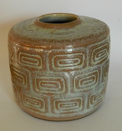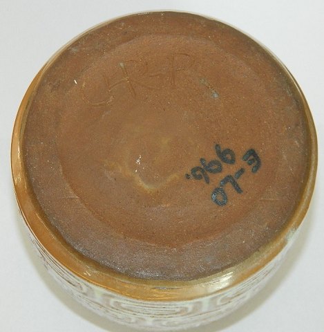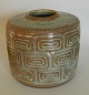 Vase in ceramic with weak bluish glaze. Produced by Christian Poulsen (1911-1991) at his own workshop. Decorated with geometric pattern around the vase. In perfect condition. Artist Signature CHR. P. and model number on the bottom. 11 cm high and 12½ cm in diameter.