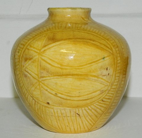 Vase i keramik af Peder Rasmussen. Gult glaseret med indridset dekoration herunder. Fremstår i god stand. Kunstnersignatur på bunden. 10½ cm høj. Diameter på 10 cm.