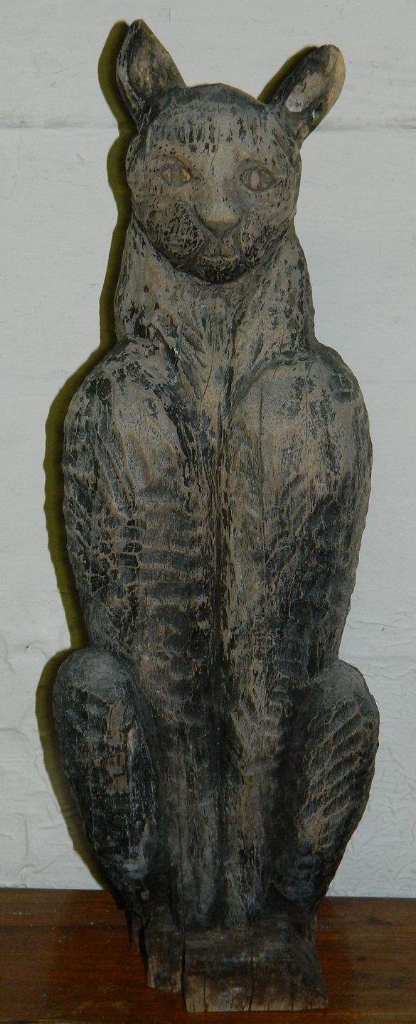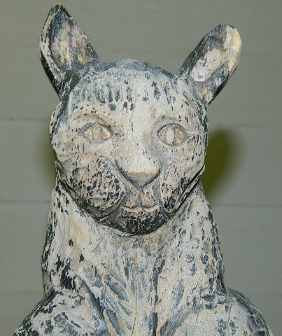 Black painted hand-carved figure of cat in wood. Made around 1860-80. Damagde on the base. Corner of this is gone - many years ago. Stand still fine as seen in the photograph. Country of origin is unknown but suspected of being cut in Scandinavia. 41 cm high.