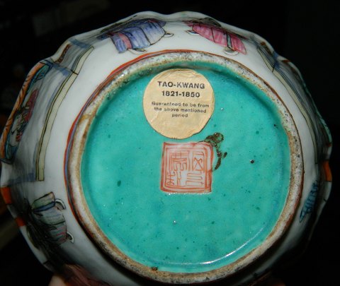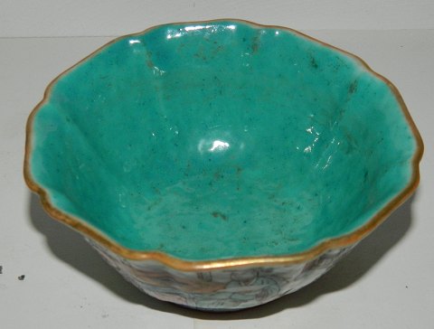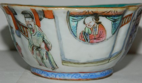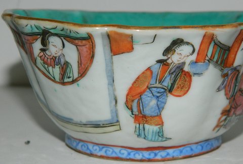 Bowl in porcelain decorated with personal gallery on the outside of the bowl. Decoration and bowl in good condition with no damage or repairs. Factory marks the bottom. 5½ cm high and 12 cm in opening diameter.