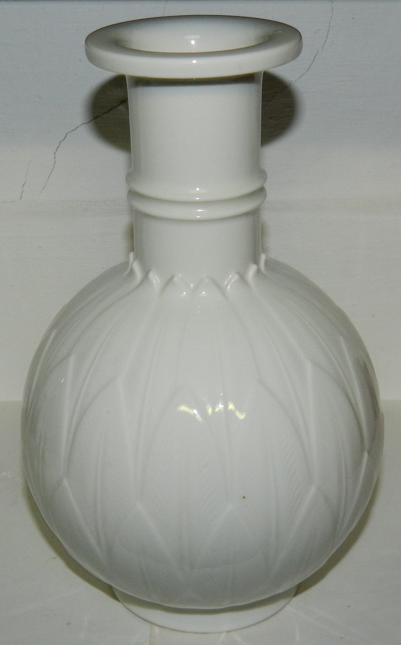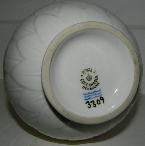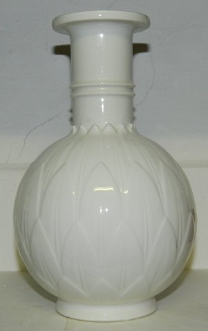Vase in porcelain by Arno Malinowski for Royal Copenhagen. Decorated with leaves in relief. Model number 3309. Factory second production. Small "sand grain" under the glaze on the surface of the flat top. Sign. monogram. 20 cm high.