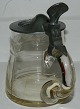 Bengit-Zinn tinlåg i jugens-stil på hankekrus i glas med slibninger. Fra begyndelsen af 20. århundrede. Låget er fabriksstemplet. Glas og låg fremstår i god stand uden skader eller reparationer. 14½-15 cm høj.