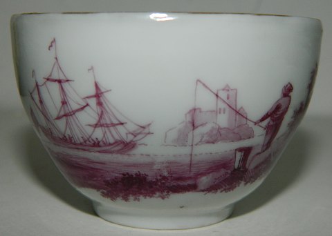EARLY KGL. PORCELAIN 18 CENTURY: Cup and saucer from Royal Copenhagen decorated with ship motif in red. Is in perfect condition. No damage or repairs. Both with factory mark. The cup are 4½ cm high. The saucer is 3 cm high and 11½ cm in diameter.