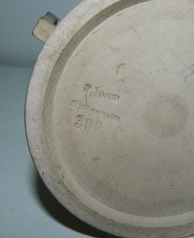 Krukke med hanke i teracotta fra P. Ipsen 19. årh. Fremstår med et par små skår ellers ingen skader eller reparationer. Glaseret indvendigt. Fabriksmærket på bunden. 10½ cm høj.