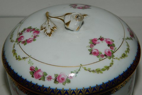 Lågskål i porcelæn fra Meissen 20. århundrede. Fremstår i god stand uden skader eller reparationer. Blomsterdekoration på underdel og låg. Lågknop i form af rose. Fabriksmærket på bunden. 12 cm høj.