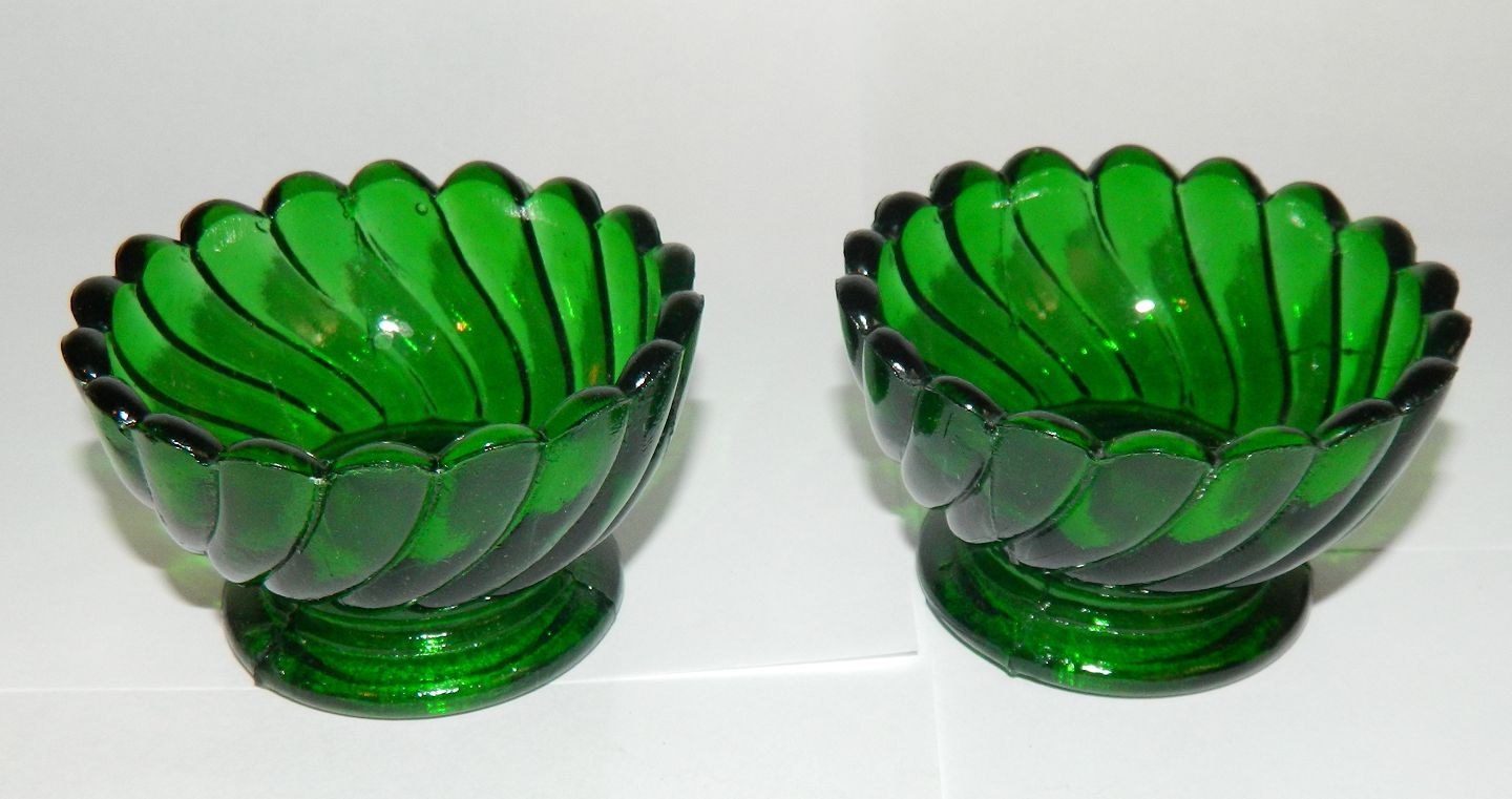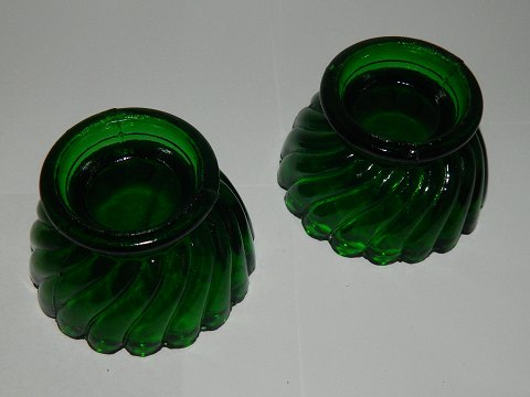 Par grønne saltkar i presset glas. Fremstillet midt i 20. århundrede. Ingen skader eller reparationer. 4½ cm høj og 7½ cm i diameter.