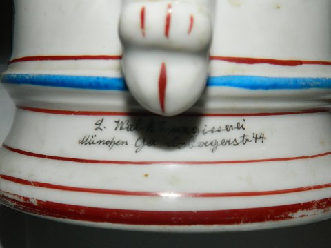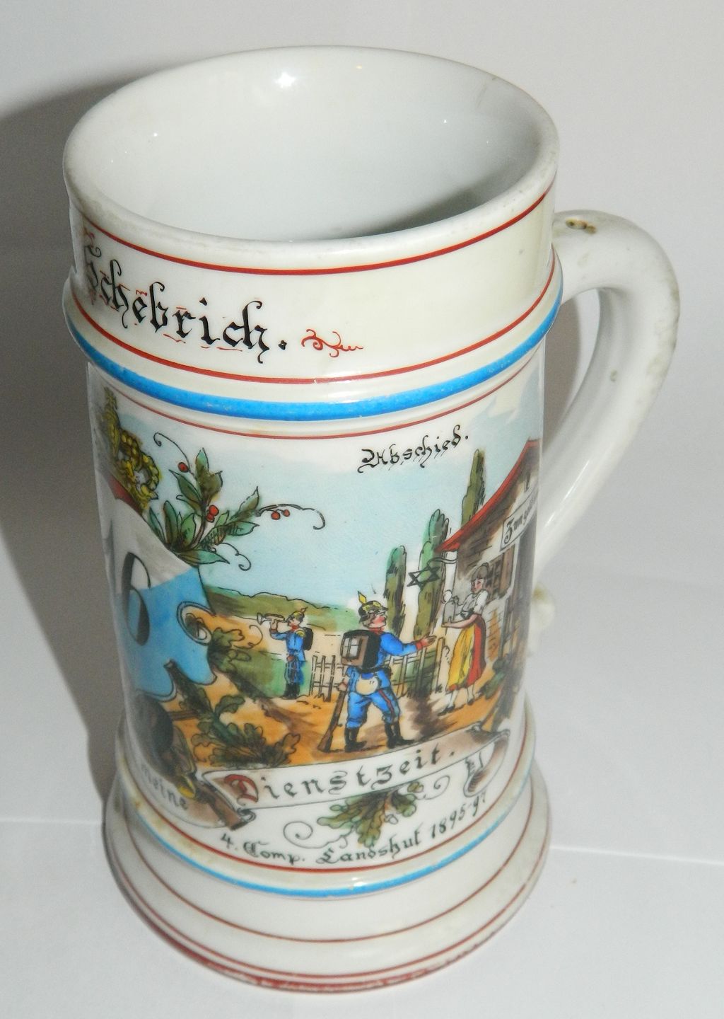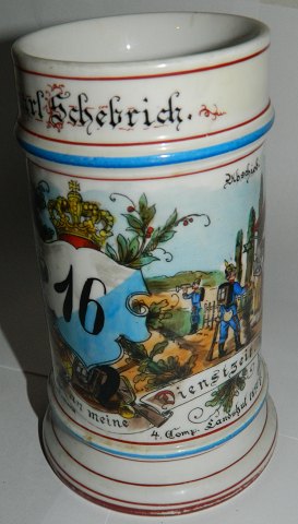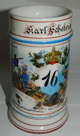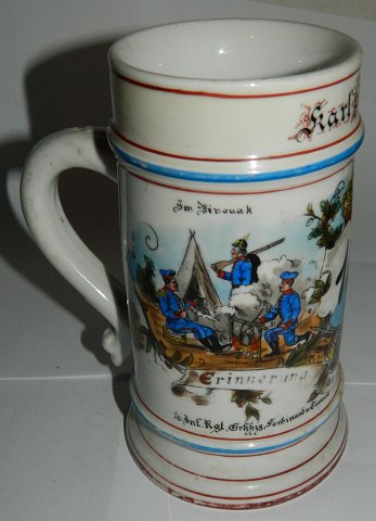 Tysk soldaterkrus. Håndmalet i slutningen af 19. århundrede. Fremstår i god stand uden skader eller reparationer. Motiv i bunden af kruset. 16½ cm høj.