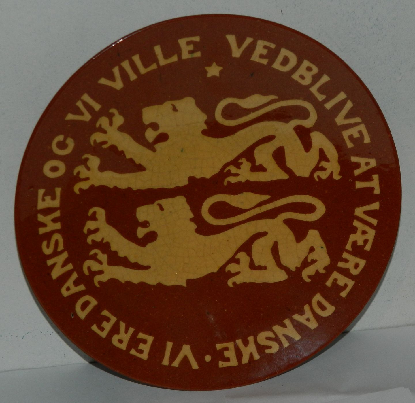 Unification Plate from 1920 produced for C. V. Kjær at the factory of Michael Andersen & Son on Bornholm: "WE ARE DANISH AND WE WILL REMAIN DANISH" The plate is in perfect condition. Factory Stamped on the back. 21½ c, in diameter.