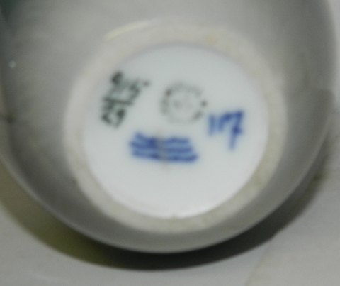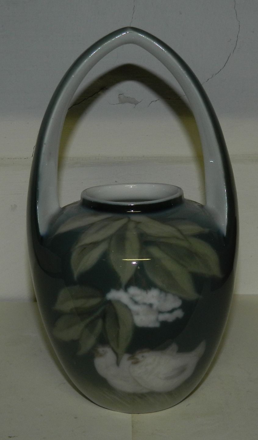 SKØNVIRKEPERIODEN: Krukke med høj hank fra Royal Copenhagen. modelnummer 915/29. Fremstillet mellem 1900-1923. Dekoreret med høns. Låget mangler. Fremstår i god stand. Ingen skader eller reparationer. 18½ cm høj.