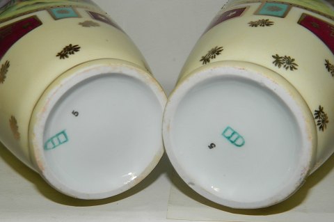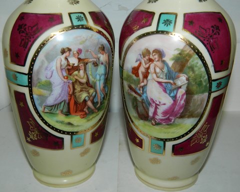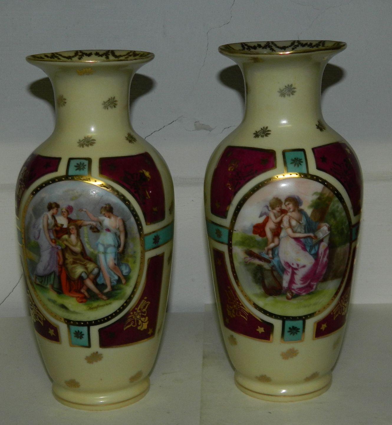 Pair of vases in porcelain from Royal Vienna factory in Austria. Decorated with classic romantic motifs. Is in perfect condition. No damage or repairs. Factory marked on the bottom. One motif signed Kaufmann. 20 cm high.