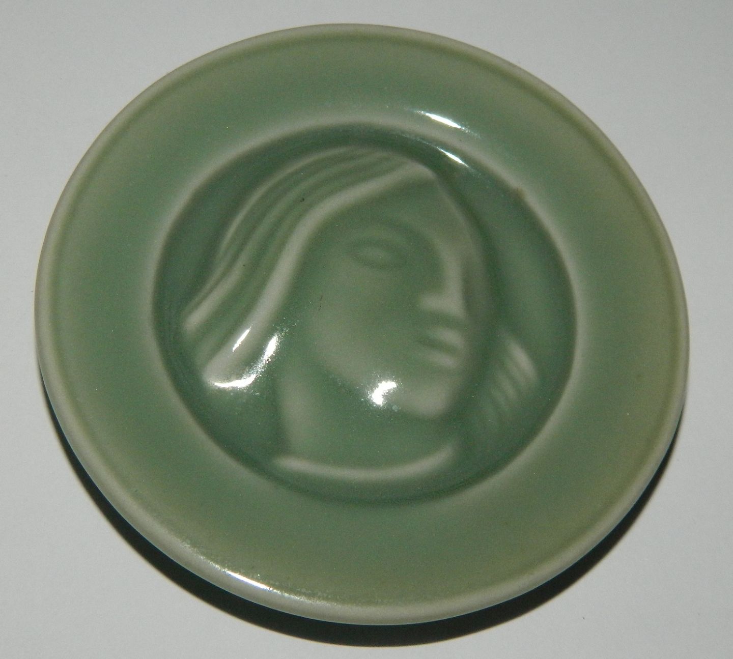 Plaque in stoneware by Royal Copenhagen. Decorated with a head. Covered with green celadon glaze. Designed by Jais Nielsen. Is in perfect condition. Factory first production. Factory marks on the backside together with artist signature. 8 cm in diameter.