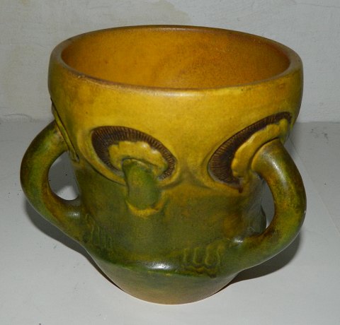 Vase in pottery from Peter Ipsen, Copenhagen. Made around 1900. Decorated in Art Nouveau style with organic handles and mushrooms. In perfect condition. No damage or repairs. Factory marks on the bottom with indistinct model number. 16 ½cm high and 17½ cm in diameter.