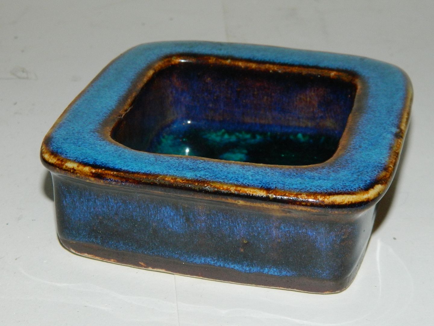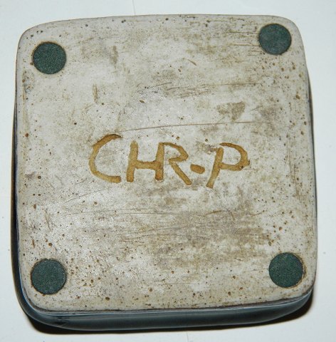 Small four-sided tray in stoneware by Christian Poulsen. Covered in blue glaze. Is in perfect condition. Signed on the back by the artist. 3½ cm highand bottom measures 8½cm x 8 ½ cm.