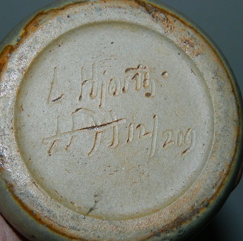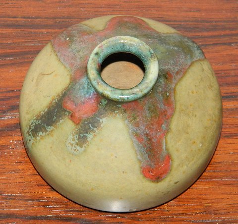 Vase i stentøj fra L. Hjorth, Bornholm. Fremstillet af Hans Adolph Hjorth i 1912. Løbende glasur i rød og grønne farver. Fabriksmærket på bunden af kunstneren samt signatur HAH. Mærket 12/209 - Emne nr. 209 i 1912. 5½ cm høj - Bundens diameter er 7½ cm.