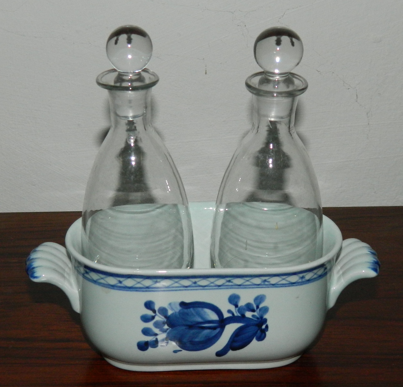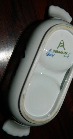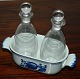 Tranquebar oil and vinegar set from Alumina with original bottels. All parts in good condition with no damage or repairs. Factory first production. The bowl factory mark on the bottom. The bowl is 5½ cm high and 14½ cm long. The bottels is 14 cm high.