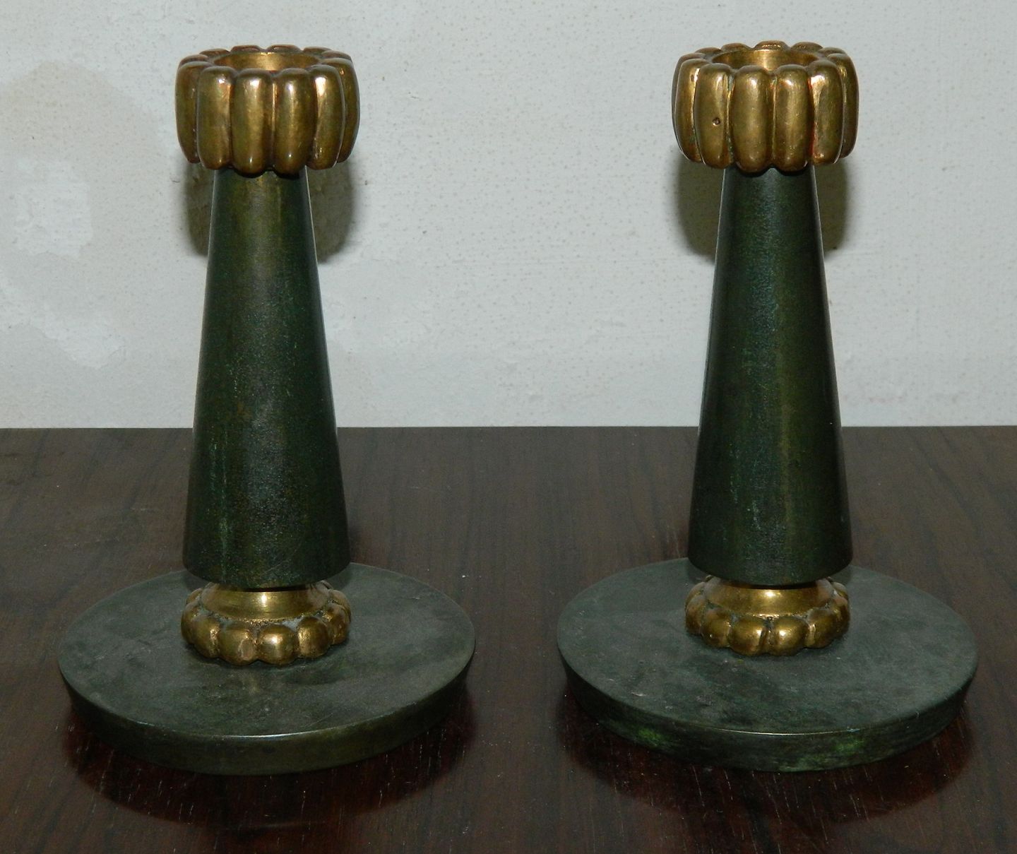 Danish made Art Deco candlesticks in bronze from 1920. In fantastic condition with no damage or repairs. Great patina on the surface. 14 cm high.