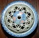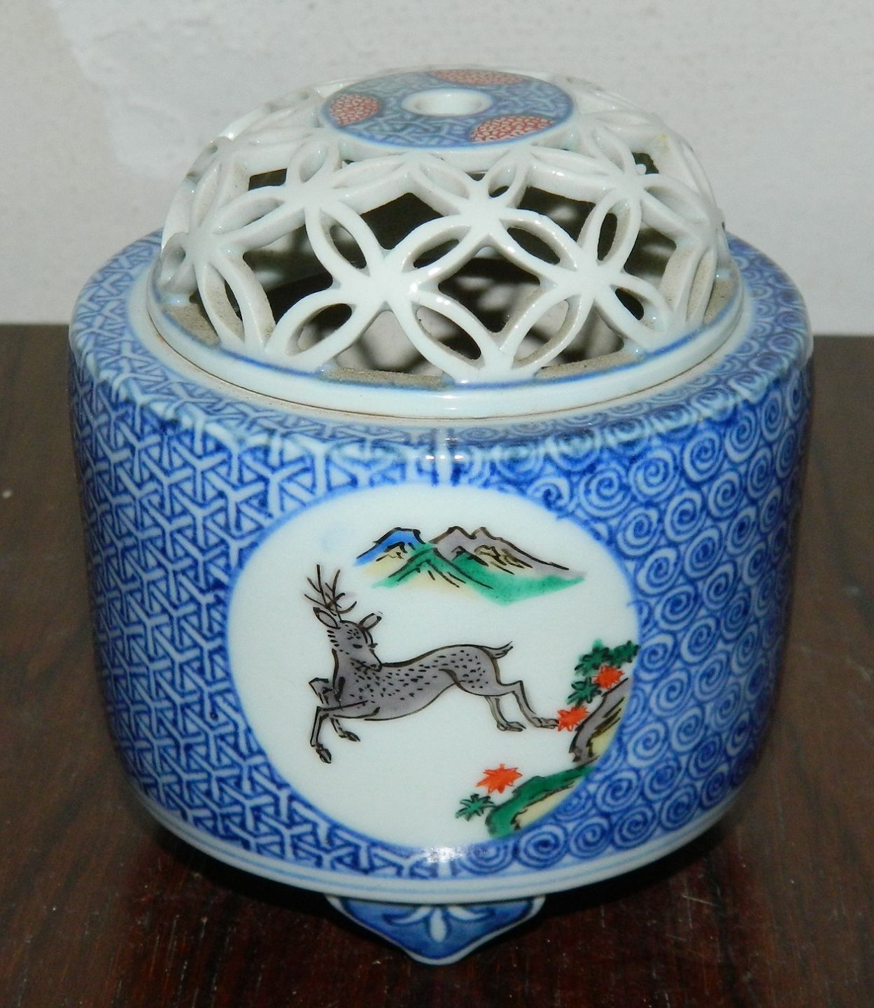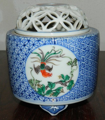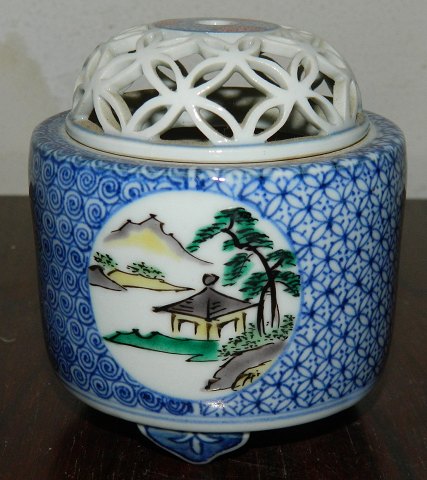 Censer on three feet in porcelain from China. Decorated with blue pattern. Three medallions, each with a painted motif. Lid with full lace decoration. Made in the 20th century. Factory mark on the bottom. In perfect condition. 9½ cm high