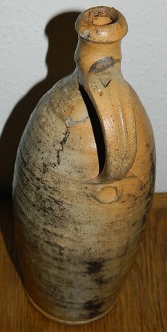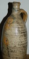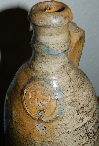 Slim salt glazed jar with decoration of cross. From 18th. -19th. century middle Europe - probably made in Germany. Cross may be able to relate production or belonging to a monastery?!? Chip on the bottom edge. Moreover crack that runs on the front (see photo). 29 cm høj.