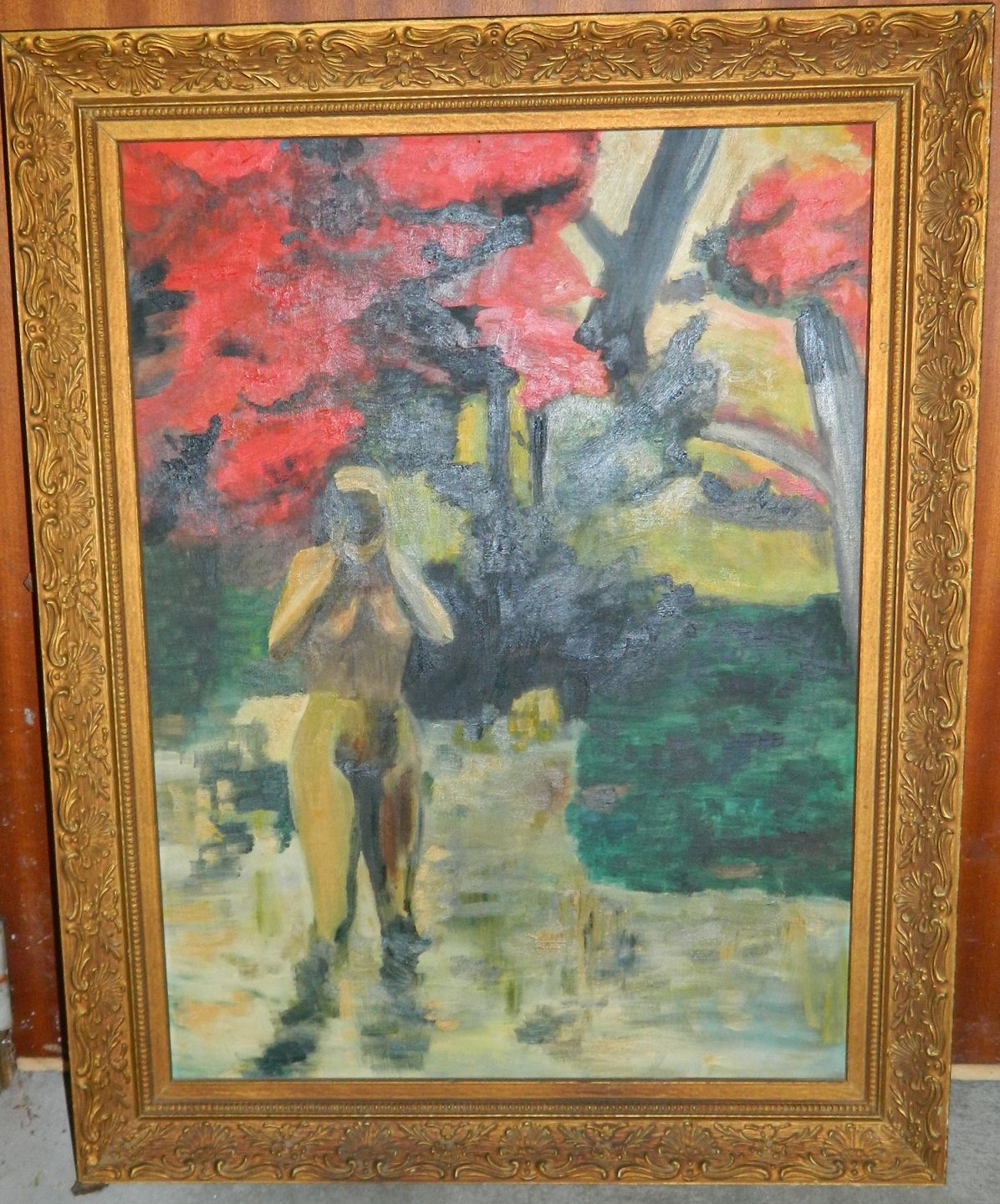 Oil painting on canvas of nude woman bathing. Unknown artist around 1940. Glued on board. Without damage or repairs. Dimensions incl. frame: 71 cm x 56 cm - (61 cm x 39 cm)