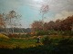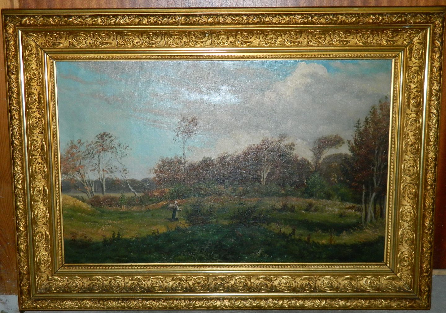 Oil painting on canvas showing a woman on her way home with collected firewood on her back. Heavy gold plated wooden frame. Painted around 1900 by unknown artist. Not signed. Dimensions incl. frame 77 ½ x 55 ½ cm (39 cm x 61 cm)