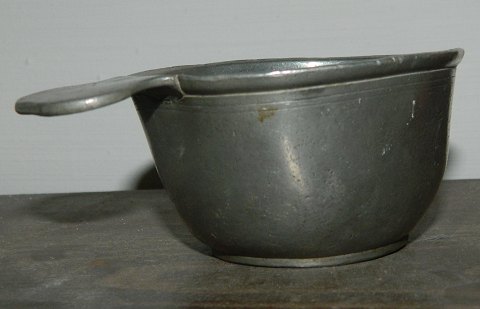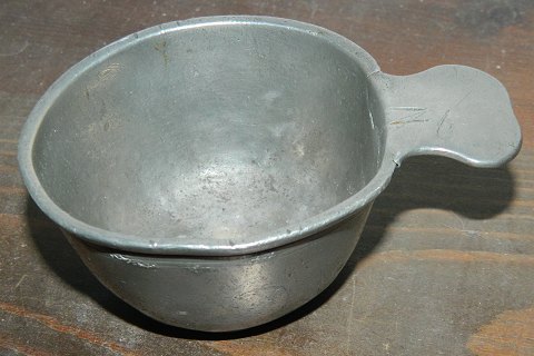 Small cup with handle in pewter. Made in Denmark 18th. century. No damages or repairs. Normal Wear of use. Marks on the bottom. 4 ½ cm high