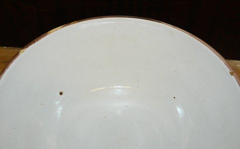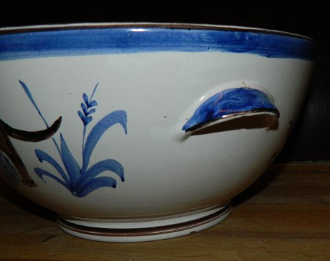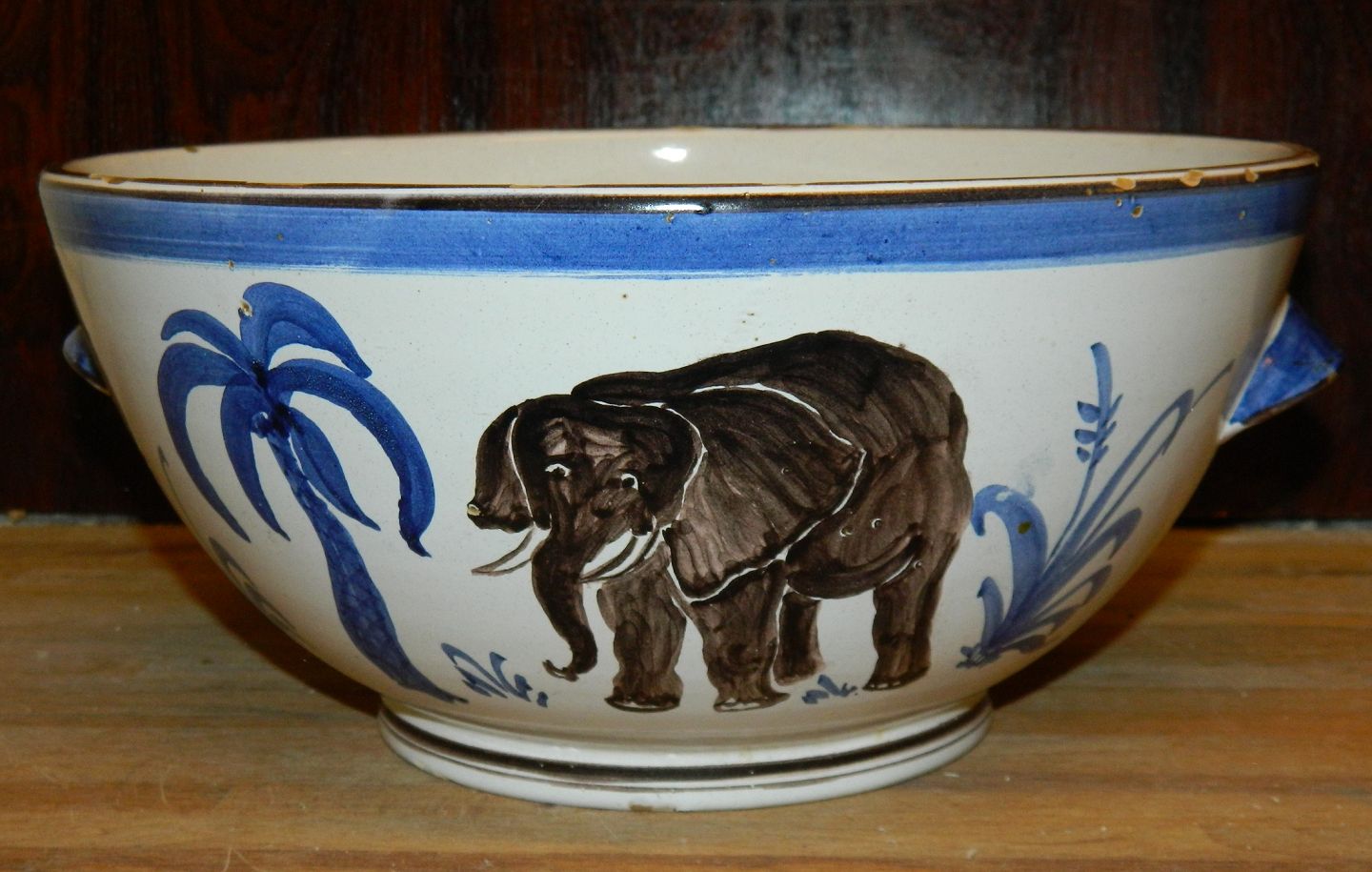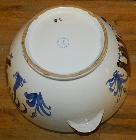 Stor skål af Odette Syberg (1907-1993) fra ca. 1950. Dekoreret med elefant på den ene side og en tiger på den anden side. Skålen har flere glasurafslag. Fremstår uden skader eller reparationer. Fabriksmærket med det velkendte Syberg logo samt kunstnersignatur O.S. på bunden. Skålen er 15½ cm høj og 30 cm i åbningsdiameter.