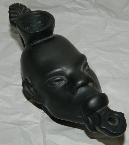 Afrikansk mandehoved i keramik som olielampe. På højre side mindre revne (produktionsfejl) ellers i god stand uden skader eller reparationer. Fremstillet i begyndelsen af 20. århundrede hos Lauritz Hjorth, Bornholm. Fabriksmærket på bunden: L. HJORTH BORNHOLM modelnr. 754. Olielampen er 7 cm høj og 17 cm lang.