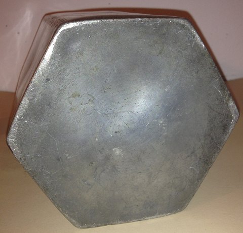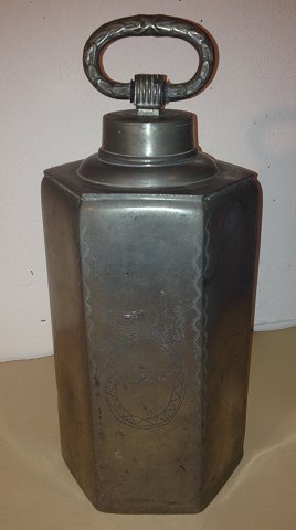 Sekskantet beholder i tin med låg. Dekoreret med oval punslet ramme med ejerens initialer heri. Fremstår i god stand med almindeligt brugsslid. Fremstillet i første halvdel af 19. århundrede. Ingen skader eller reparationer. Højde incl. opretstående hank: 30½ cm.