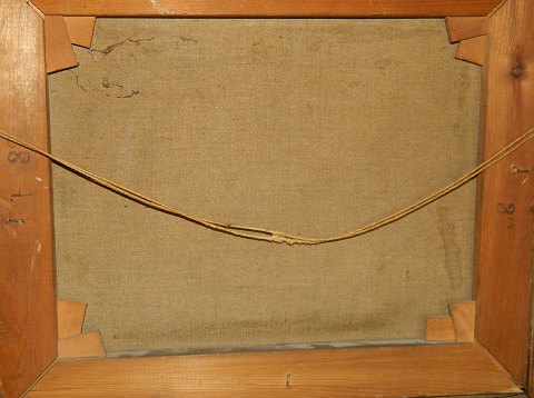 Maleri: Olie på lærred med motiv fra ubekendt dansk havn. Malet af Heinrich Nielsen (1929-) ca. 1940. Fremstår i god stand med lidt overflade ridser på ramme og motiv. Mål: 52 cm x 45½ cm.