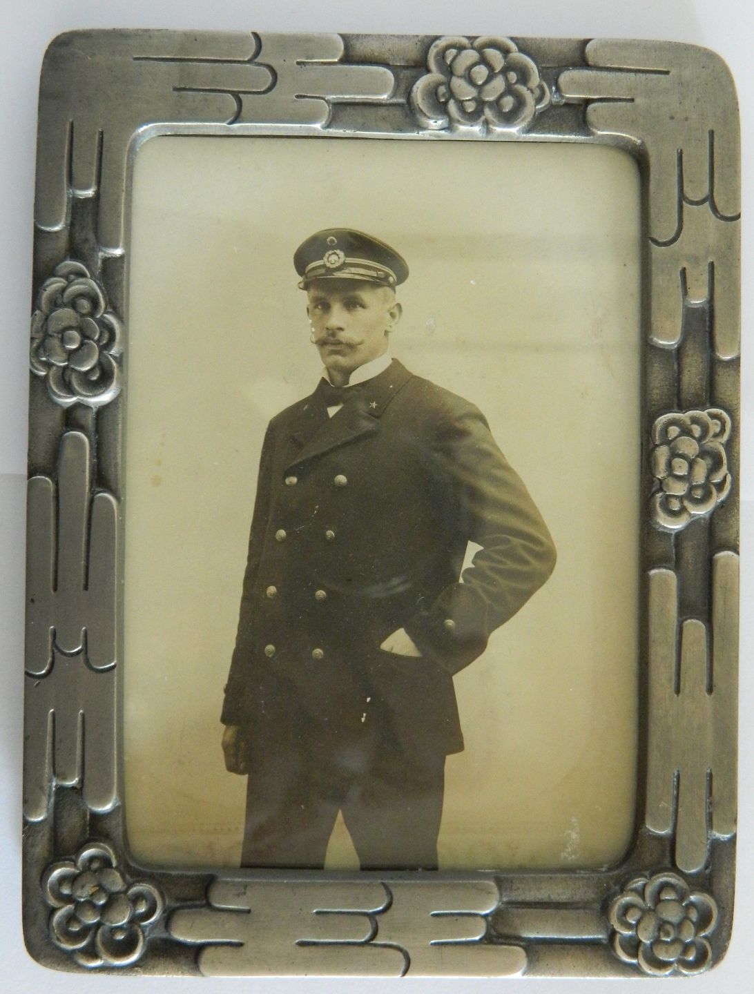 LIGNENDE KØBES Ramme i Skønvirkestil: Billedramme i tin udført af Mogens Ballin (1871-1914), Danmark. Fremstillet omkring 1900. Fremstår i god stand. Ingen skader eller mangler. Rammens fod på bagsiden intakt. Fabriksmærket MB på bagsiden samt modelnummer T 123. Fotografi medfølger ikke ! Mål: 13 cm x 17 cm.