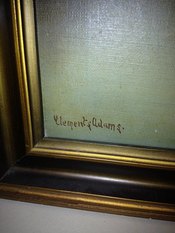 Oliemaleri på lærred. Motiv med køer i forgrunden samt bjerge i baggrunden. Signeret Clement Adams. Overflade samt lærred og rammen i god stand uden skader eller reparationer. Rammens mål: 36 cm x 46 cm