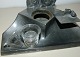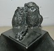 Blækhus i tin fra Mogens Ballin´s efterfølger H. P. Hertz. Dekoreret med par ugler. Glasindsats i god stand. Tin og glas uden skader eller reparationer. Fabriksmærket på bunden. Fremstillet i 1917. Ubekendt kunstner. Mål: 9½ cm høj og penne-bakken er 18 cm lang.