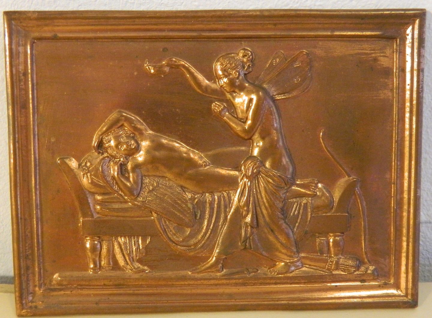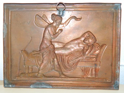 Plate of copper with the motive of Bertel Thorvaldsen: "Psyche approaching light to the sleeping Cupid." The original modeled on Nysø 1841. In good condition with no damage or repairs. Normal use wear. Supposed made around 1920 in Denmark. Dimensions: 10½ cm x 12½ cm.