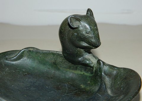 Figur af mus på askefad i metal fra skønvirkeperioden i Danmark omkring 1920. Fremstår i god stand med almindeligt brugsslid. På bagsiden stemplet DANOMETAL W. GREEN MADE IN DENMARK. 6½ cm høj - fadet er 13 cm langt.