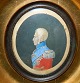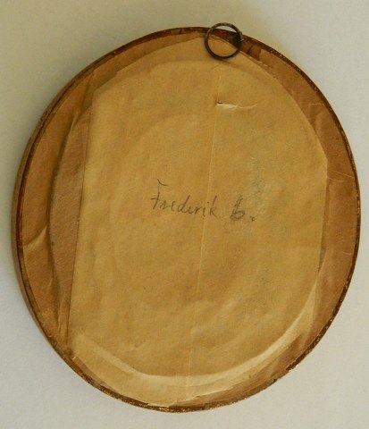 Bemalet tryk fra ca. 1840 af Kong Frederik VI. Motiv samt ramme i god stand. Rammen er 12 cm høj og 10½ cm bred.