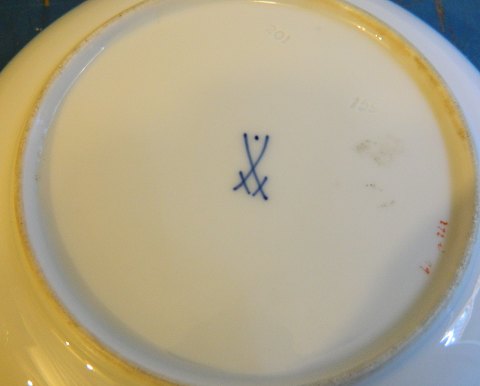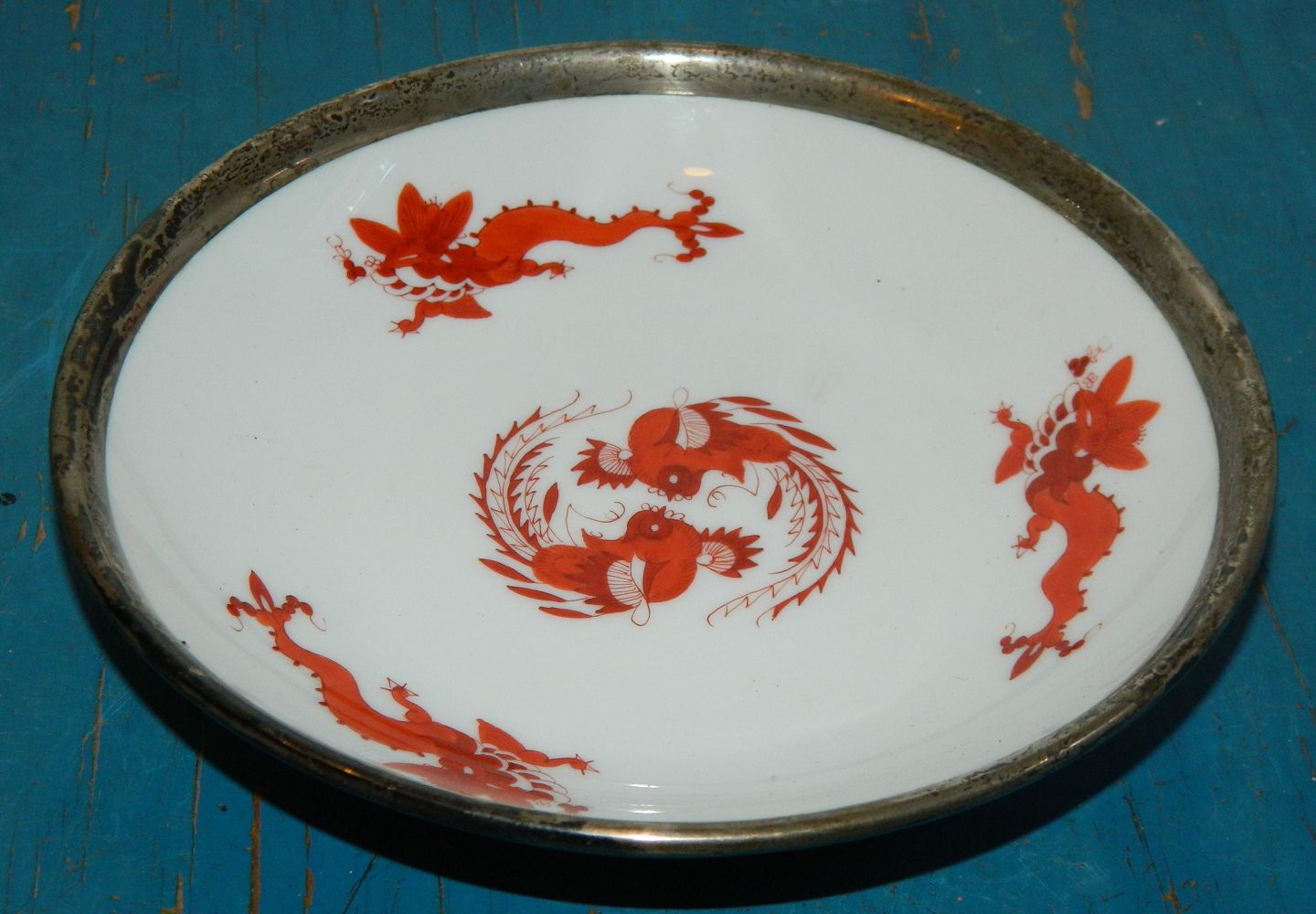 Mindre tallerken fra Meissen, Tyskland, ca. 1900. Dekoreret med drager i rødt ! Metaldekoration på kanten. Ikke sølvstemplet ! Metalkant skyldes muligvis reparation. Tallerknen er fabriksmærket på bunden. 3 cm høj og 15½ cm i diameter.