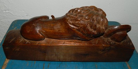 Figur af Bertel Thorvaldsen´s "Switzerløve" skåret i træ. Fremstillet omkring 1900. Fremstår i god stand uden skader eller reparationer. Figuren er 11 cm høj, 25½ cm lang og 9½ cm bred.