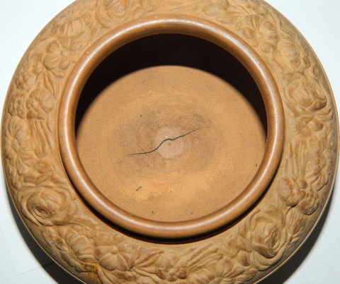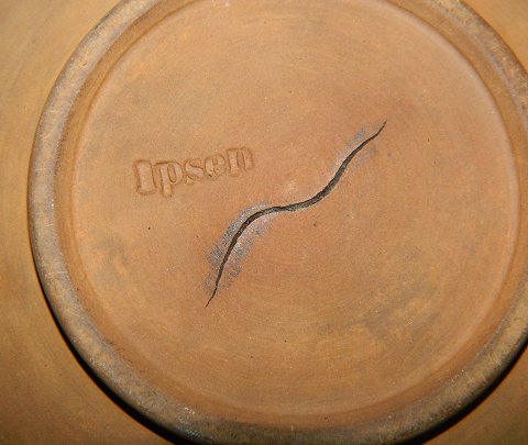 Bowl in terracotta from P. Ipsen from around 1875. Do have a small chip of the edge of the lid, and a production crack in the bottom of the bowl. Otherwise no damage. May have been painted black. Factory mark IPSEN on the bottom. 8½ cm high and 13½ cm in diameter.