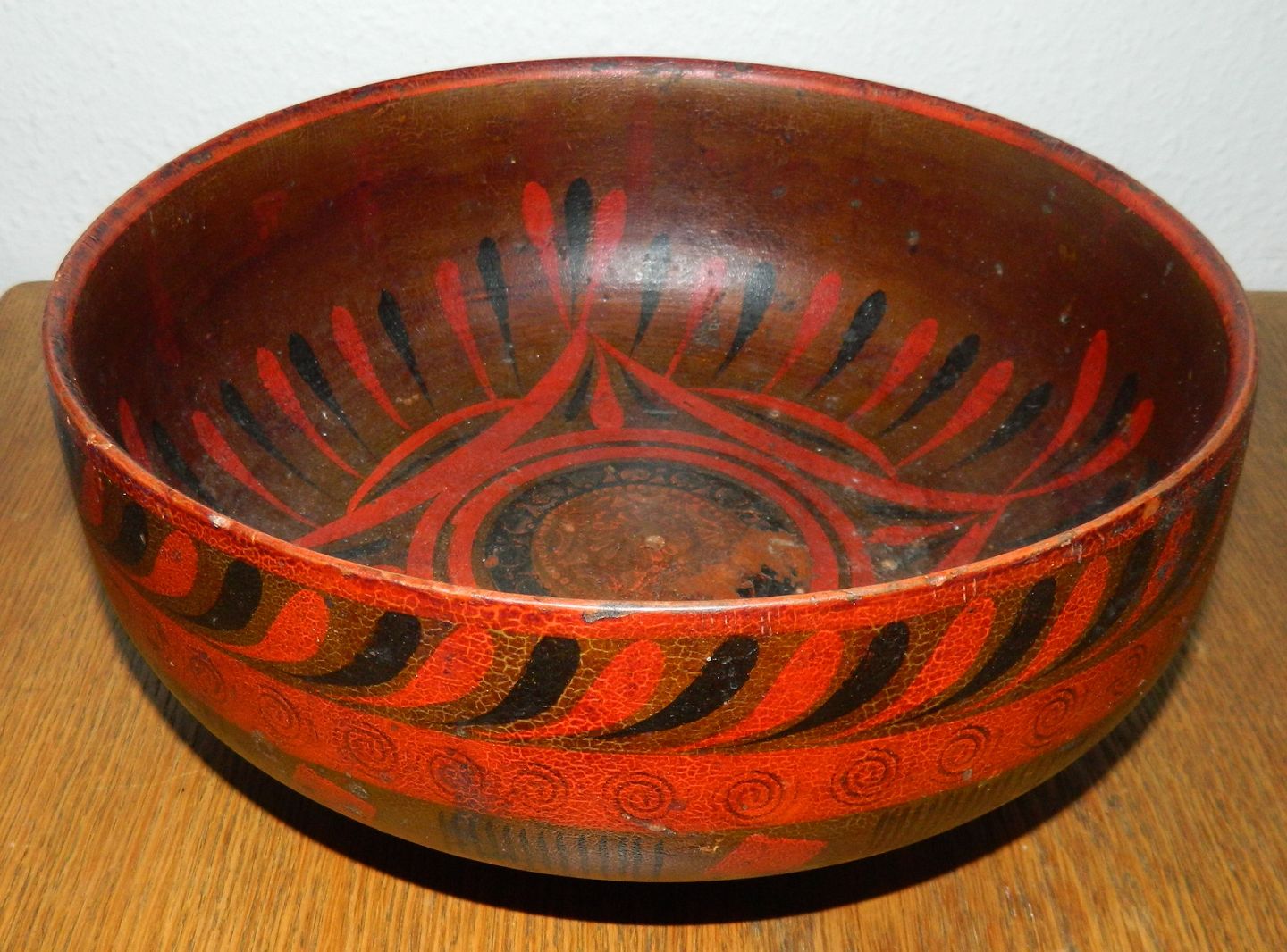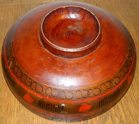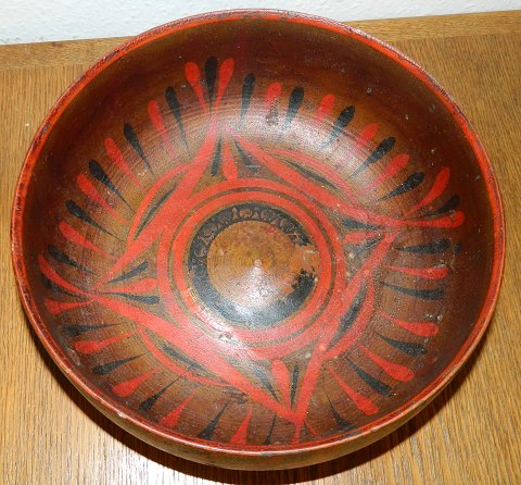 Stor bemalet russisk skål i træ fra begyndelsen af 20. århundrede. Fremstår i god stand med almindeligt brugsslid. Ingen skader eller reparationer. Skålen er 12 cm høj og åbningsdiameteren er 27 cm.