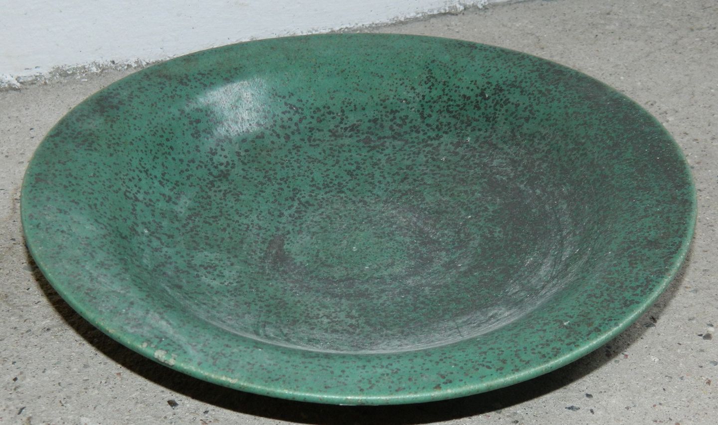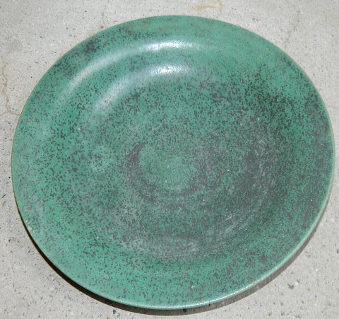 Fad i stentøj fra Arne Bang. Fremstillet omkring 1940. Fremstår i god stand uden skader eller reparationer. På for -og bagside dækket af en grøn spættet glasur. Fabriksmærket på bagsiden med AB samt modelnummer. Mål: 5½ cm høj og 28 cm i diameter.