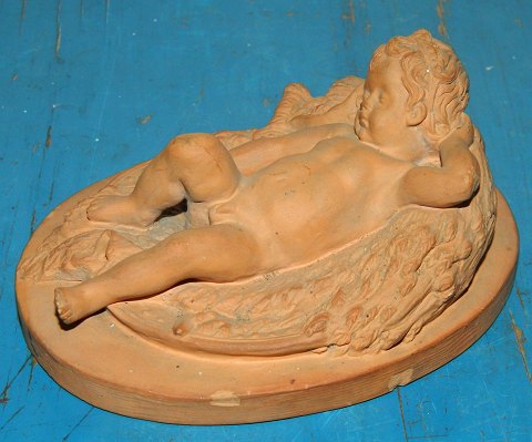 Figure in terracotta from Peter Ipsen, Copenhagen, of a sleeping boy. Has some small chips on the edges, looking at photographs and chipping on the left elbow. Factory marks on the bottom. 5 cm high and 11 cm long.