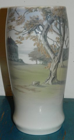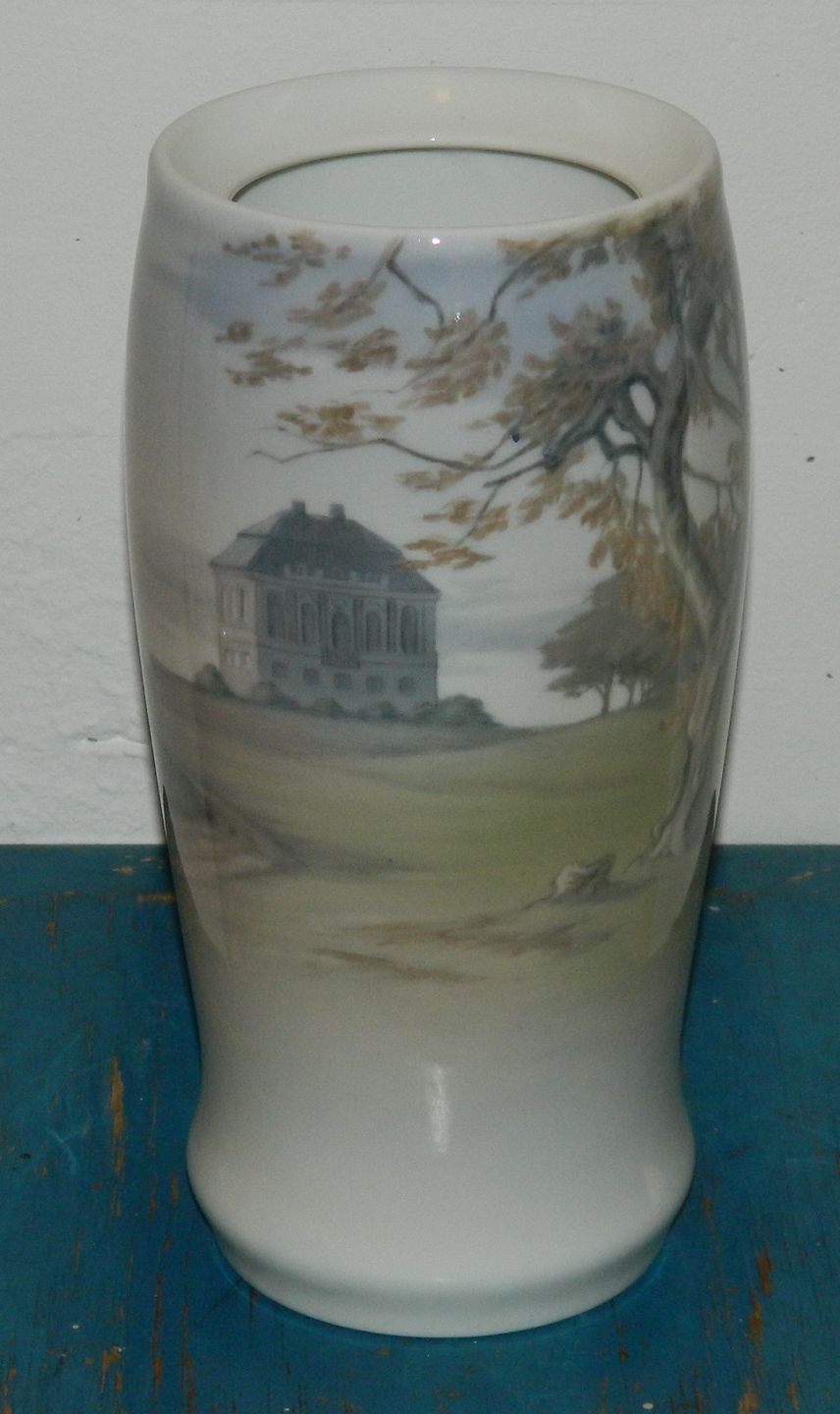 Vase i porcelæn fra Bing & Grøndahl med motiv med Eremitageslottet i Dyrehaven - Set fra retning i mod Strandvejen ! Dekoreret af Margrethe Hyldahl (1881-1963), der arbejde for B&G fra 1909 og indtil sin død. Vasen fremstår i god stand uden skader eller reparationer. Fabriksmærket på bunden. 2. sortering. 27½ cm høj