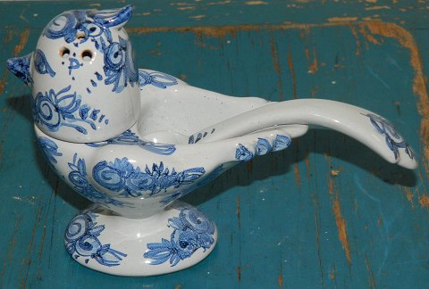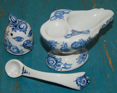 Figure in faiance from Bjorn Wiinblad. Salt and pepper bird decorated in blue. All parts are in good condition with no damage or repairs. Factory marks on the bottom. 10 cm high and 16 cm long.