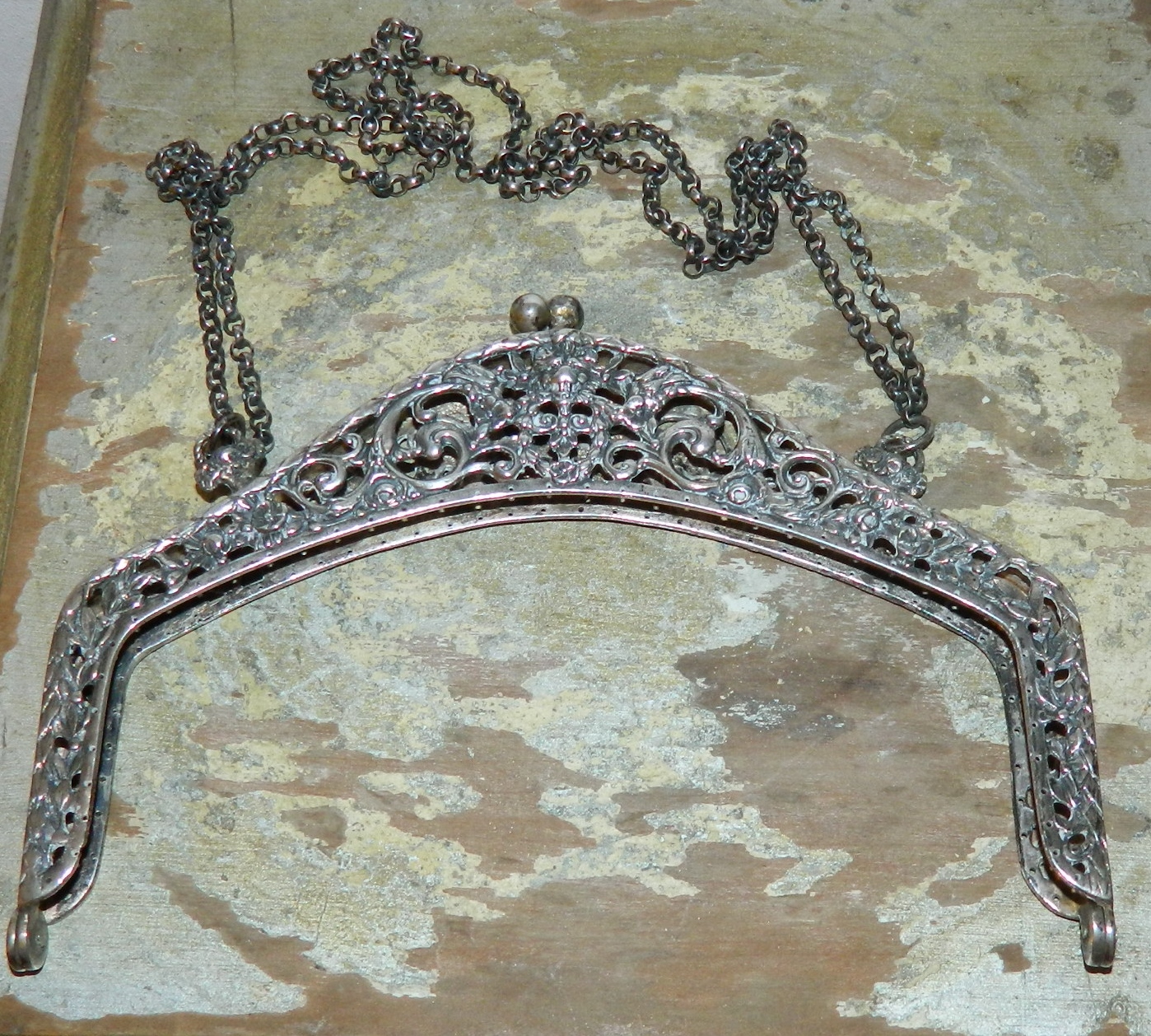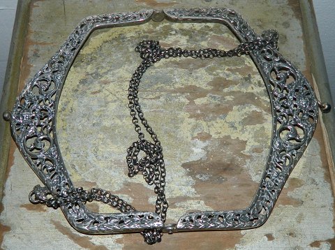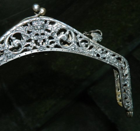 Beslag til taske i sølv. Kunne muligvis også bruges til sølvramme ! Ingen skader eller reparationer. Sølvstemplet 800. Slået sammen er den 12½ cm høj og 17½ cm lang.