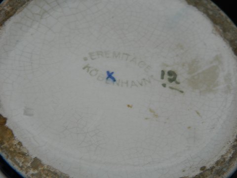 Vase i fajance fra Aluminia med Eremitage-dekoration fra omkring 1920. Fremstår i god stand med almindeligt brugssslid. Herunder mindre hårrevne på kanten (se både indvendigt og udvendigt) samt meget lille glasurafslag på kanten (se foto). Fabriksmærket på bunden med EREMITAGE KØBENHAVN samt svagt indstemplet ALUMINIA. Vasen er 28½ cm høj.