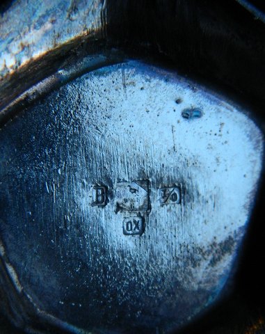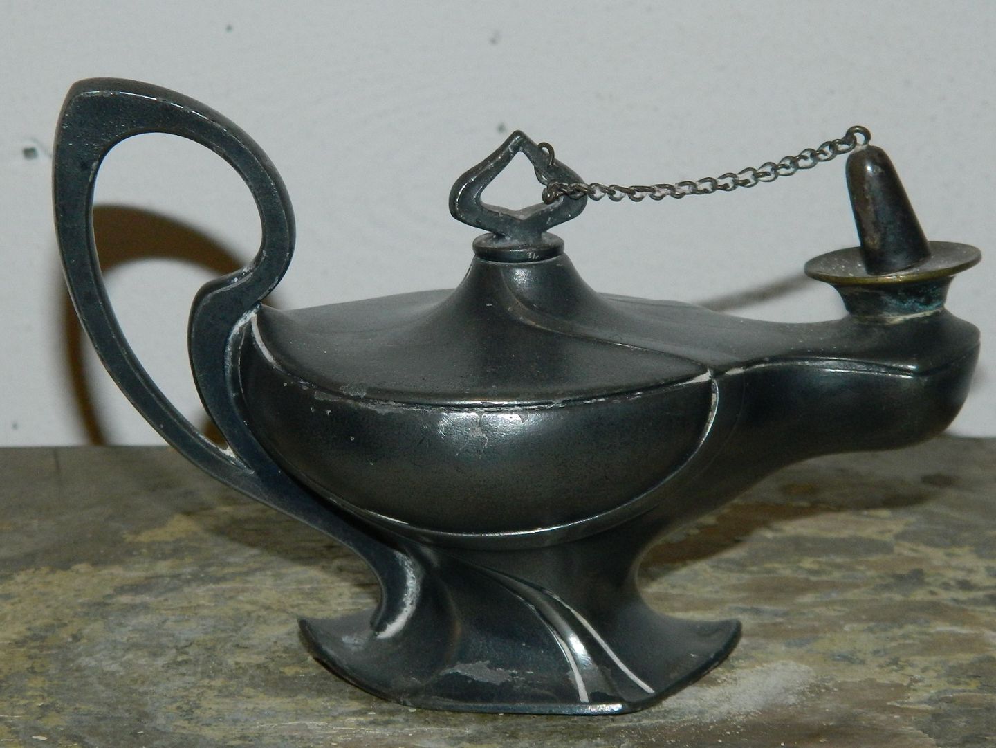 Olielampe i tin fra den tyske metalvarefabrik WMF. Fremstillet omkring 1910 i jugendstil. Fremstår i god stand uden skader eller reparationer. Fabriksmærket på bunden. Mål: 9 cm høj og 13½ cm lang.