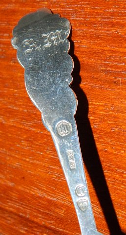 Flødeske i tang-mønster i 830S sølv. Sølvstemplet samt monogram på bagsiden. 12½ cm lang.
