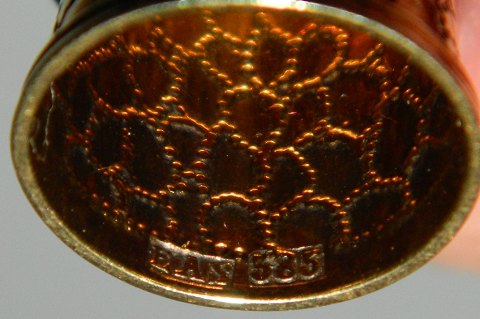 Fingerbøl i 14 karat guld med rød sten på toppen. Dekoreret rundt om fingerbøllet. Stemplet 585 indvendigt. I god stand uden skader.